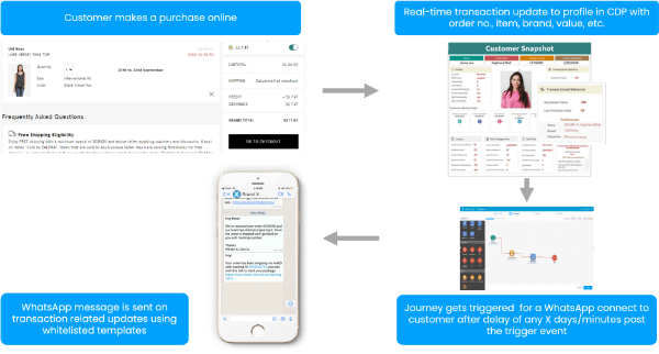 - Real-time transaction communication on Whatsapp: Leveraging Algonomy’s Campaign tool, marketers can enable triggers at various event nodules. Marketers can determine triggers, and delays (days or minutes post the event), as well as choose from templates how they would like to communicate with their audience.