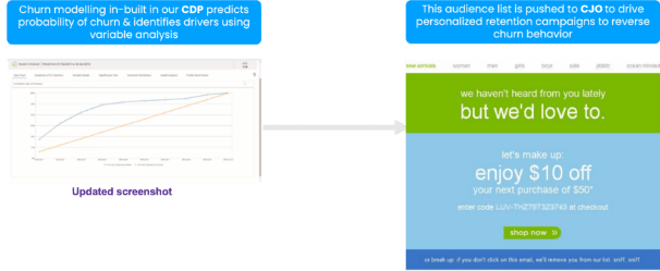 - Proactive action to arrest churn: Churn modeling in-built into our CDP enables marketers to predict the probability of churn and identifies drivers which then can be leveraged to take corrective action. This audience list is then pushed to Campaign to initiate personalized retention campaigns to reverse churn behavior.