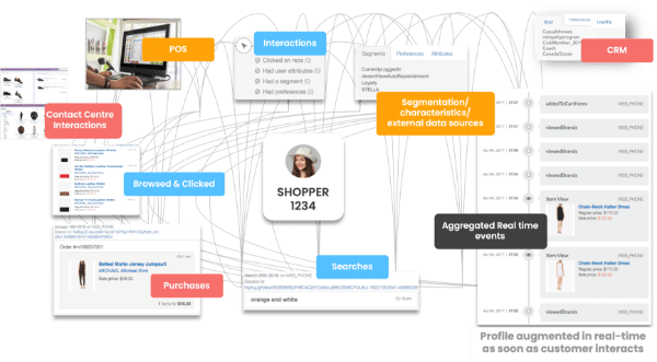 Anonymized customer data (including demographic, behavioral, and transactional) is captured and ingested in real-time from online, offline, first party, second party, and third party systems. This is then stitched together to create a unified customer profile that is updated with each customer interaction.
