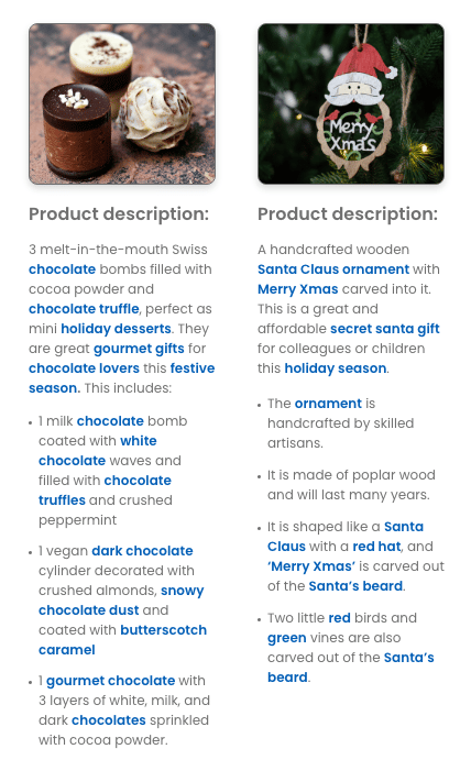 Though these products do not contain the obvious word “Christmas”, NLP associates words such as red, green, holiday, snowy, festive, merry, Xmas, Santa Claus, secret Santa, chocolate, gift, and desserts with the holiday.