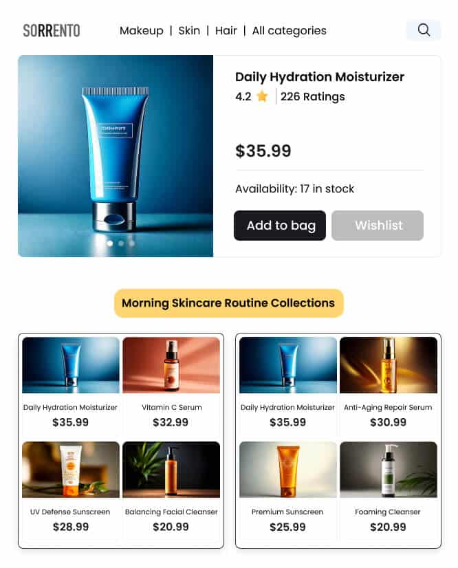Display curated collections directly on the PDP, demonstrating how the featured product can be paired with complementary items. For example, show a moisturizer alongside a matching cleanser, serum, and sunscreen, creating a complete morning skincare routine.