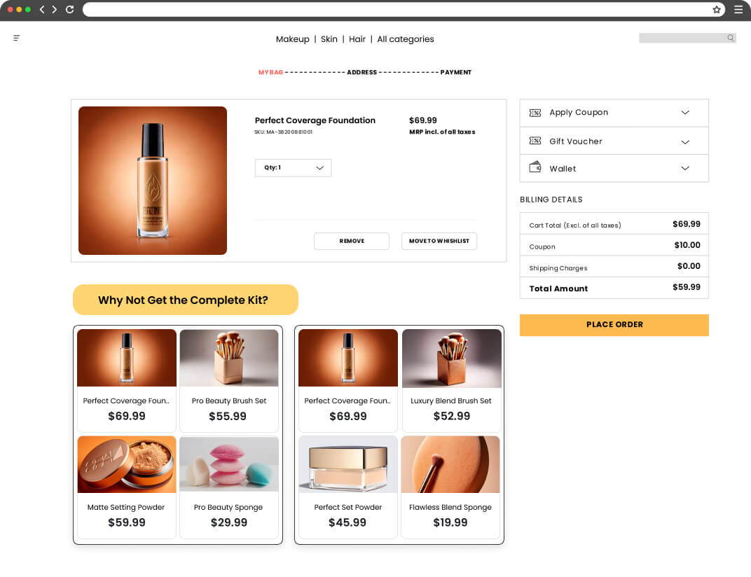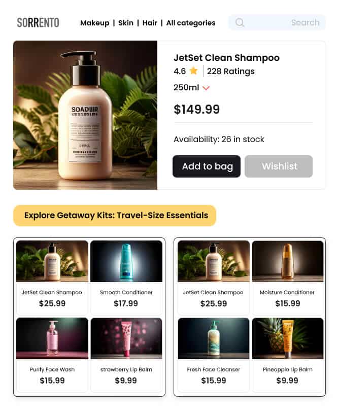 Display curated collections on the cart page that suggest complementary products tailored to items in the shopper’s cart. For instance, if a shopper has added a foundation, recommend a matching brush set, primer, and setting powder to complete their makeup routine.