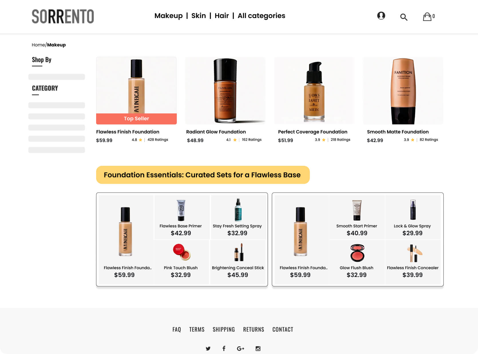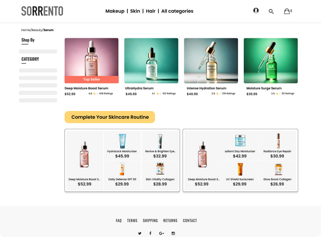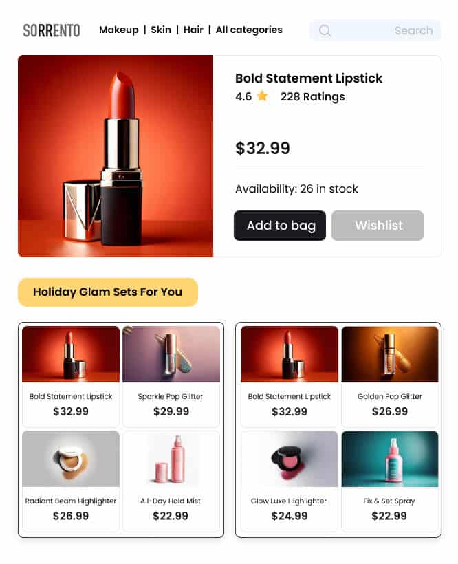 Highlight collections on category pages that combine top-selling items (e.g., popular foundations) with complementary products (e.g., primers, setting sprays, blushes) to create a complete look. By presenting these best-selling combinations, shoppers can easily see how products work together, making it simple to build a complete and cohesive look.