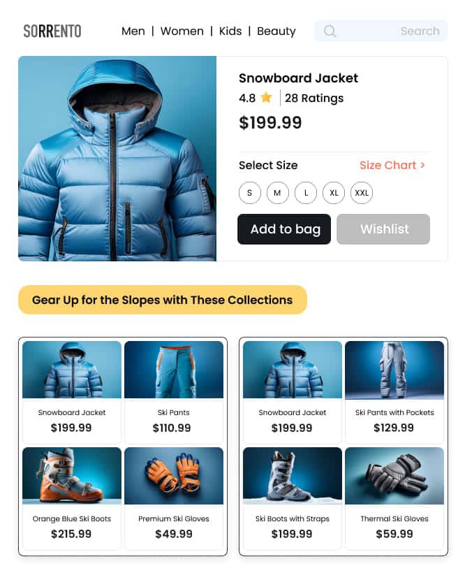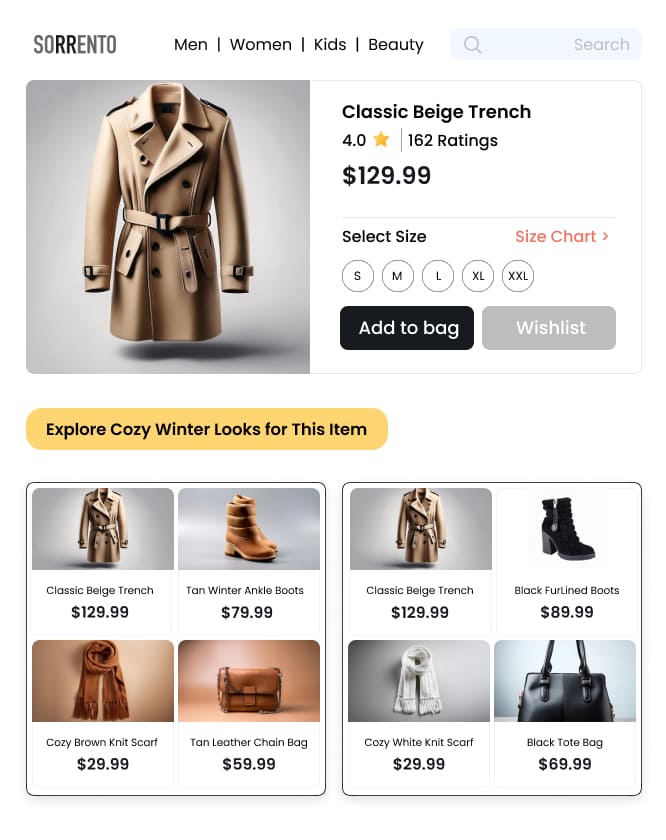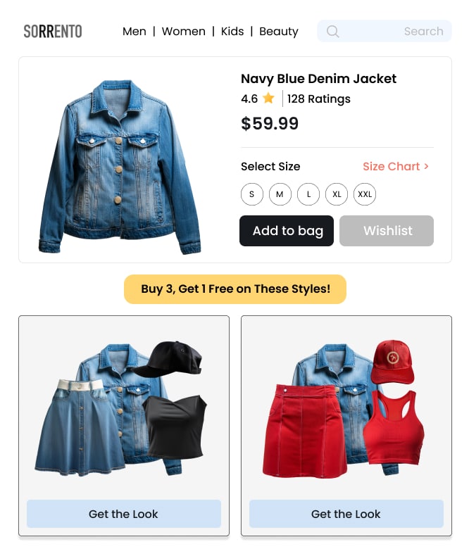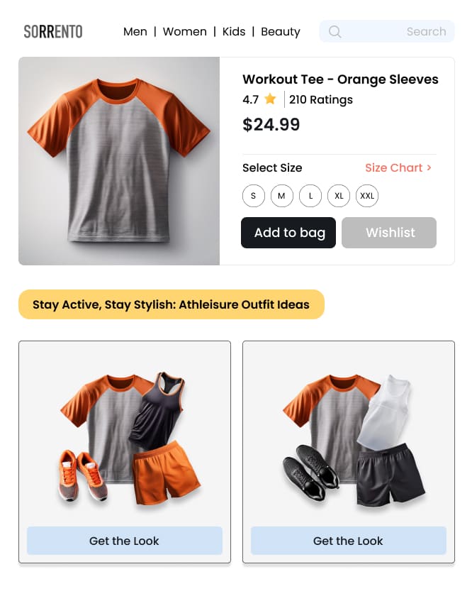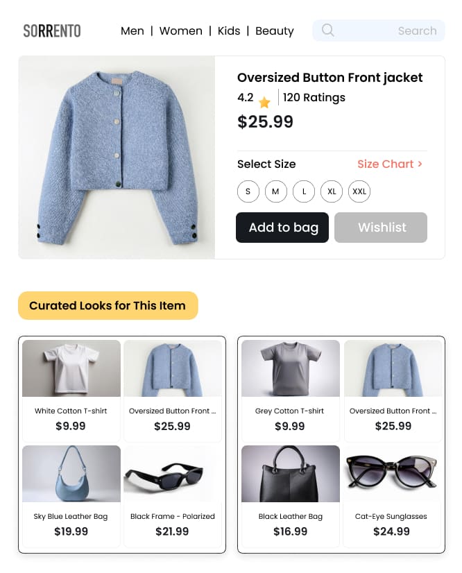 Display curated ensembles across the site to create an engaging and visually appealing shopping environment that intuitively directs shoppers toward relevant products.