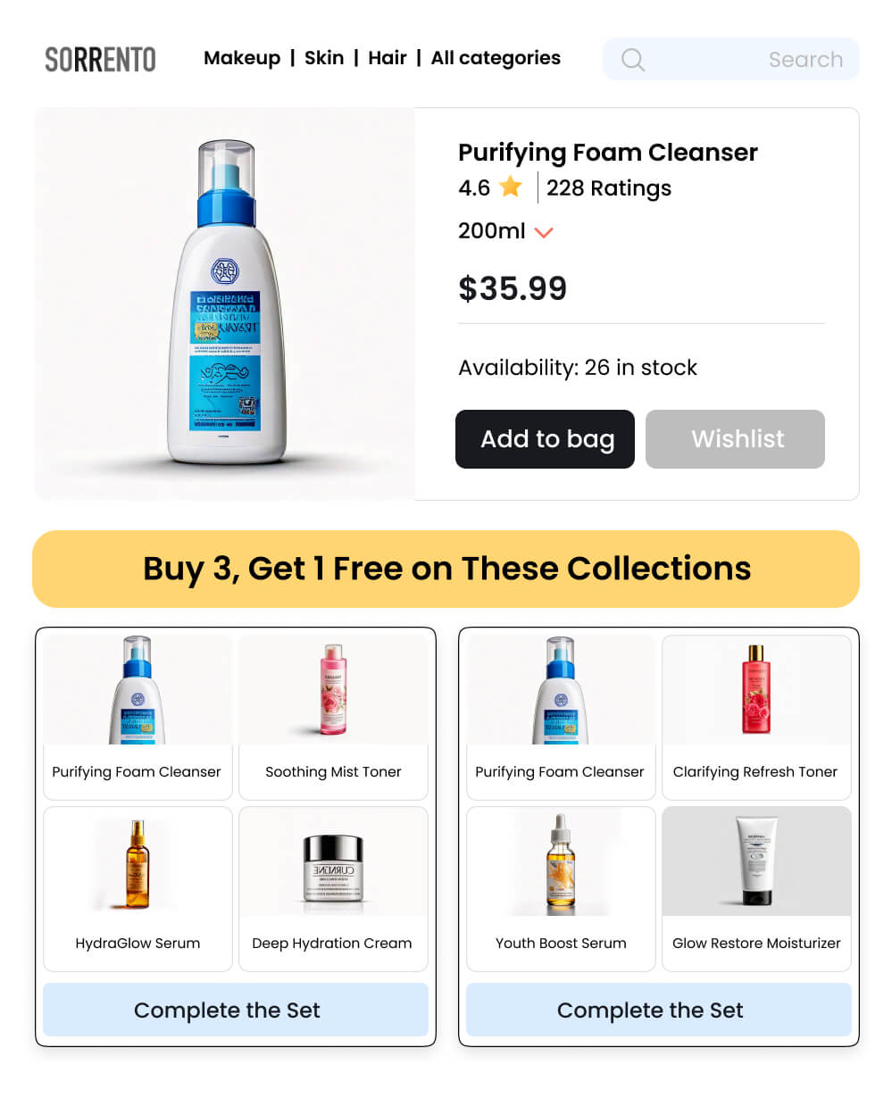 Use curated collections to promote offers like “Buy 3, Get 1 Free,” encouraging customers to purchase complete sets of complementary products. For example, feature “Skincare Essentials Sets” with a cleanser, toner, serum, and moisturizer, showing how these items work together to enhance skincare routines.