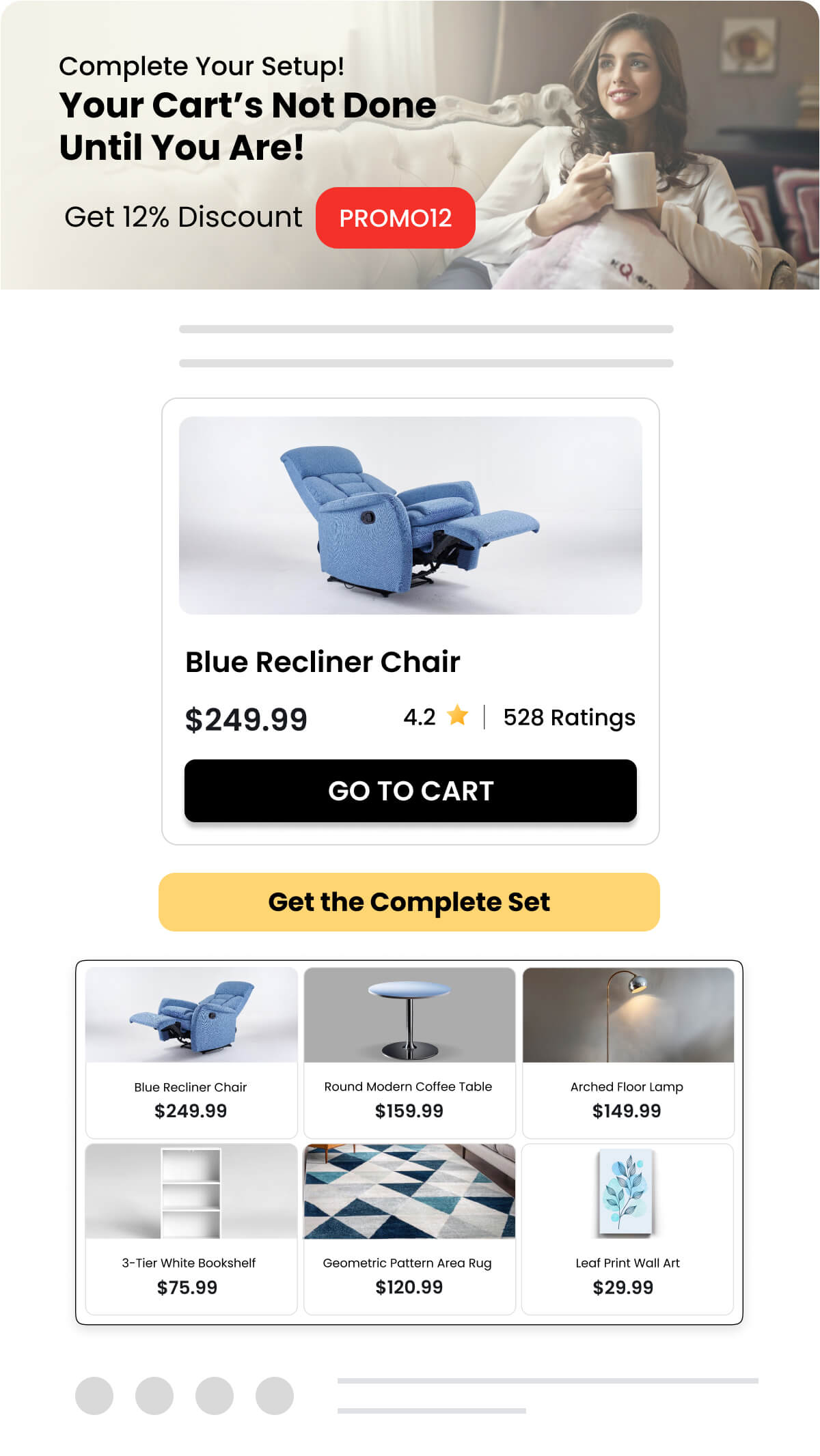 Present personalized collections in email campaigns to remind shoppers of furniture or decor items they viewed or left in their cart, along with suggestions for complementary pieces to complete their space.
