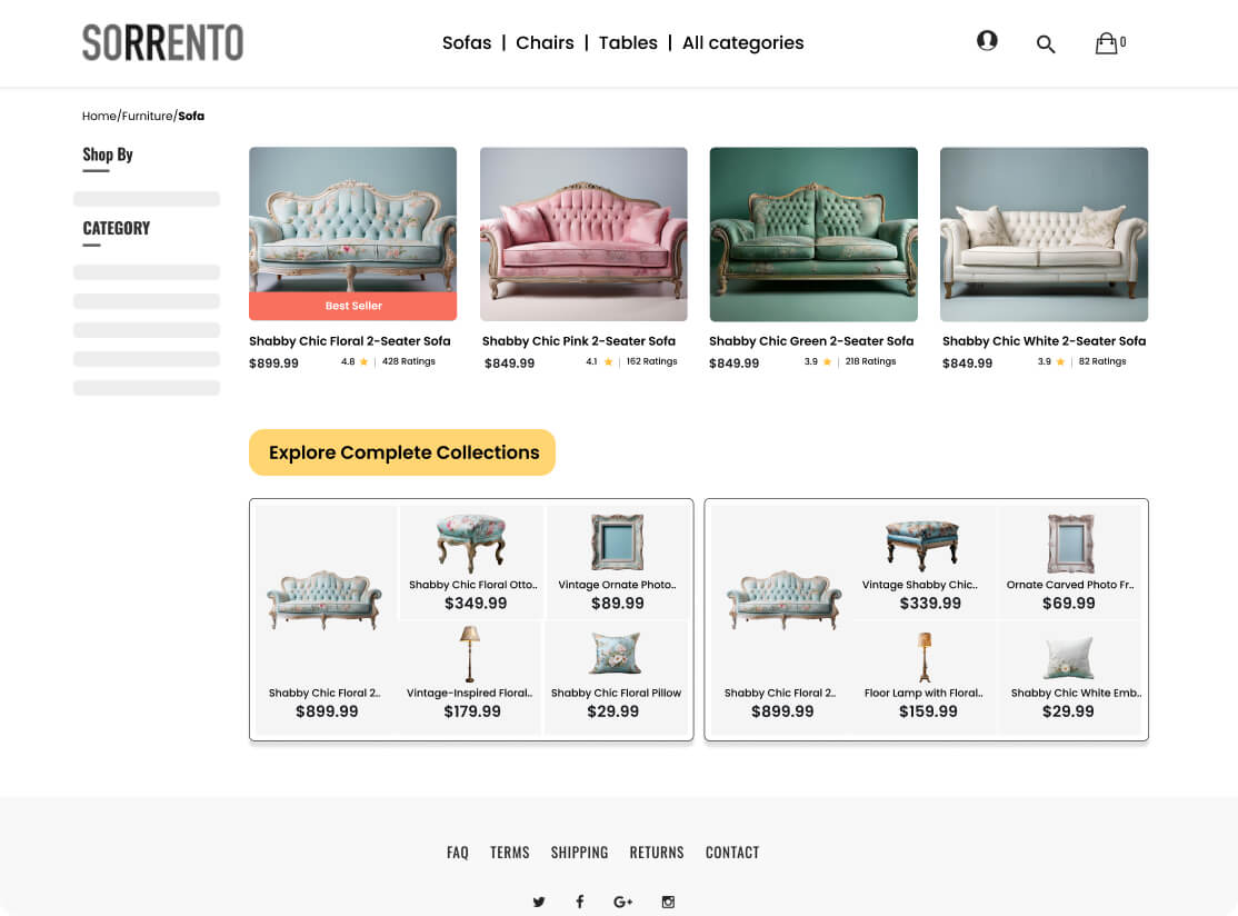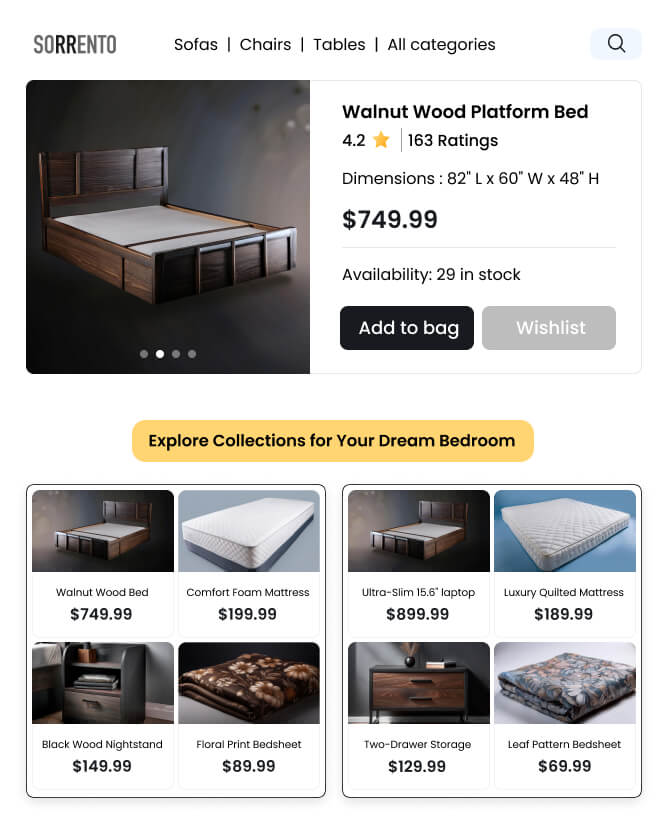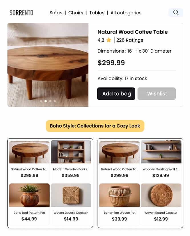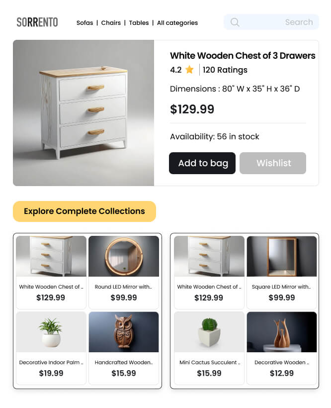 Present curated collections at various website touchpoints to create an engaging and visually appealing shopping environment that intuitively guides shoppers toward relevant furniture and decor items.