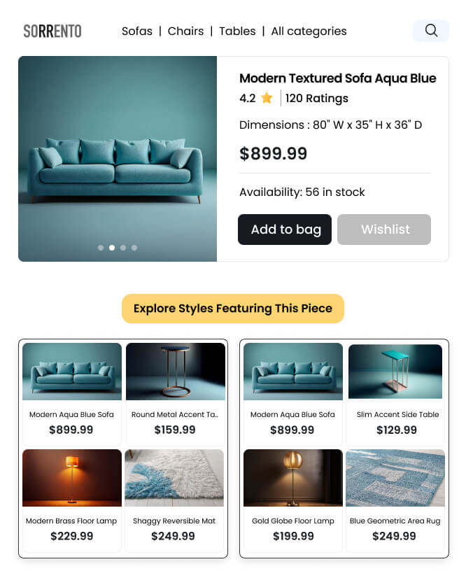 Display curated collections directly on the product detail page (PDP), showing how the featured item (e.g., a sofa) can be paired with complementary pieces (like side tables, lamps, or rugs). This approach helps shoppers see the item as part of a complete room setting, enhancing its appeal.