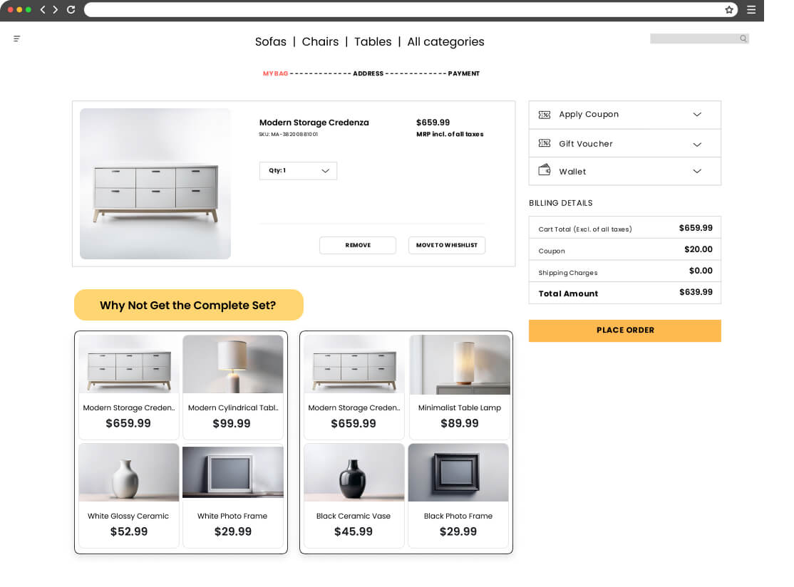 Present curated collections on the cart page to recommend items that complement the products in the cart, such as matching cushions, throws, or wall art for a sofa purchase.