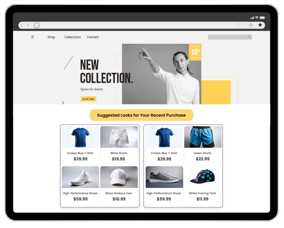 Display tailored collections on the home page based on the shopper’s browsing behavior or purchase history, creating a customized welcome that aligns with their taste.
