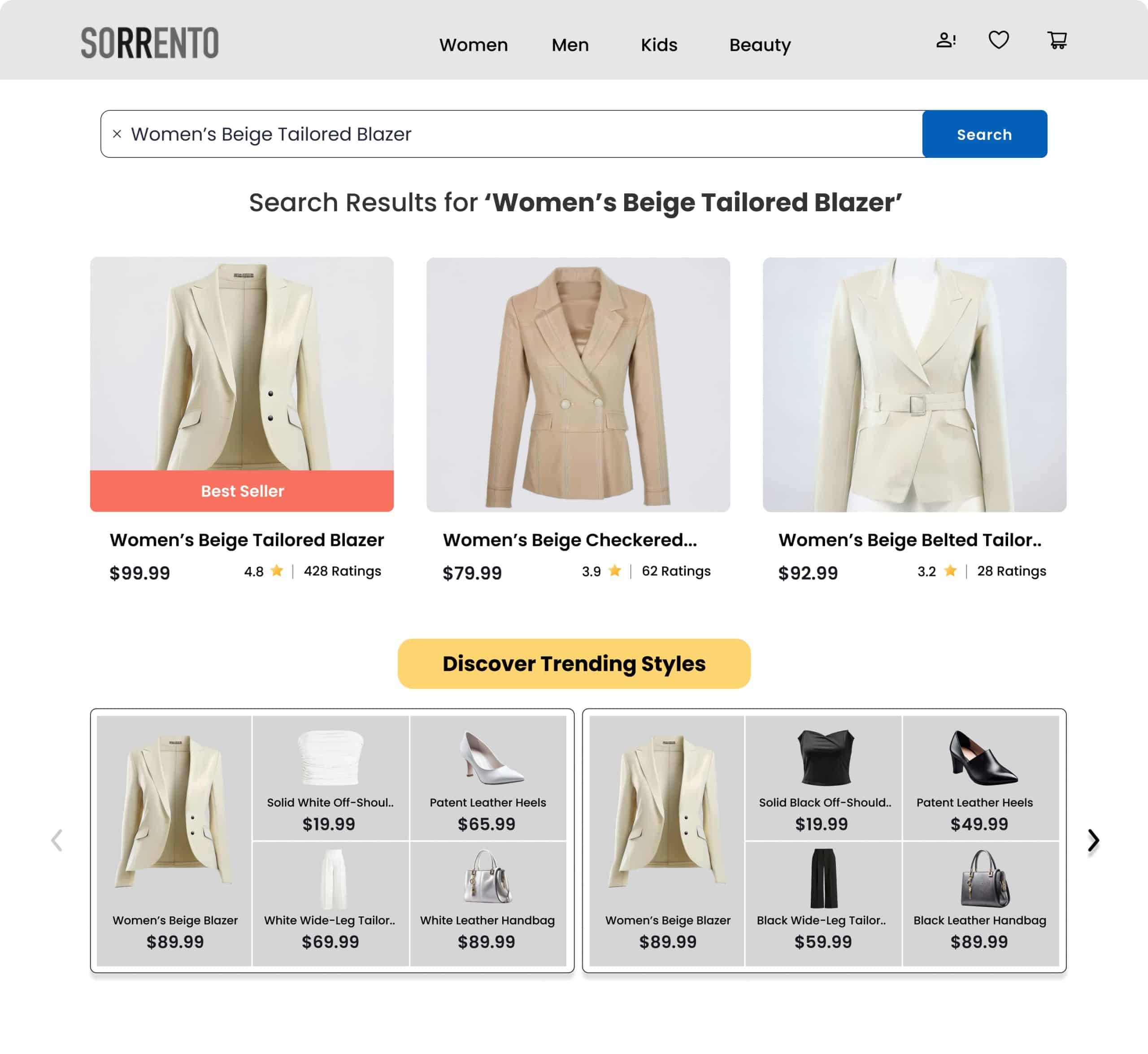 Highlight trending styles and curated ensembles on the search results page based on the shopper’s query, providing inspiration and increasing product visibility.