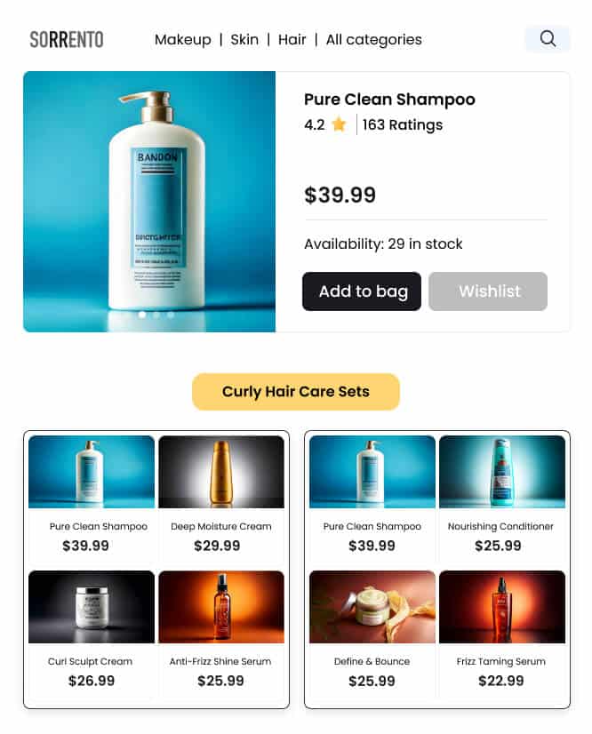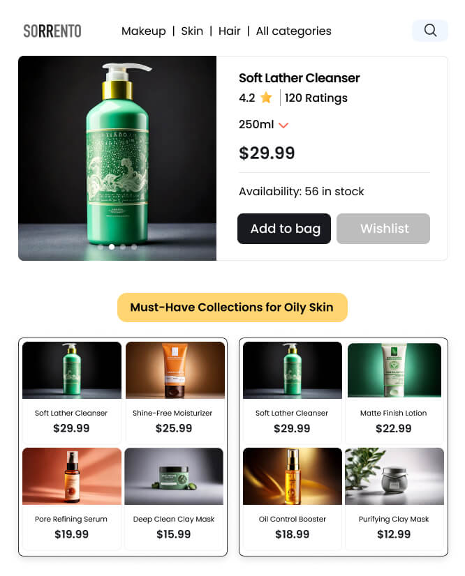 Create personalized product collections that reflect each shopper’s preferences, behavior, and beauty concerns (e.g., anti-aging, acne-prone skin), providing targeted recommendations. For example, suggest an anti-aging set for a shopper focused on mature skin, including a retinol serum, firming moisturizer, and eye cream.