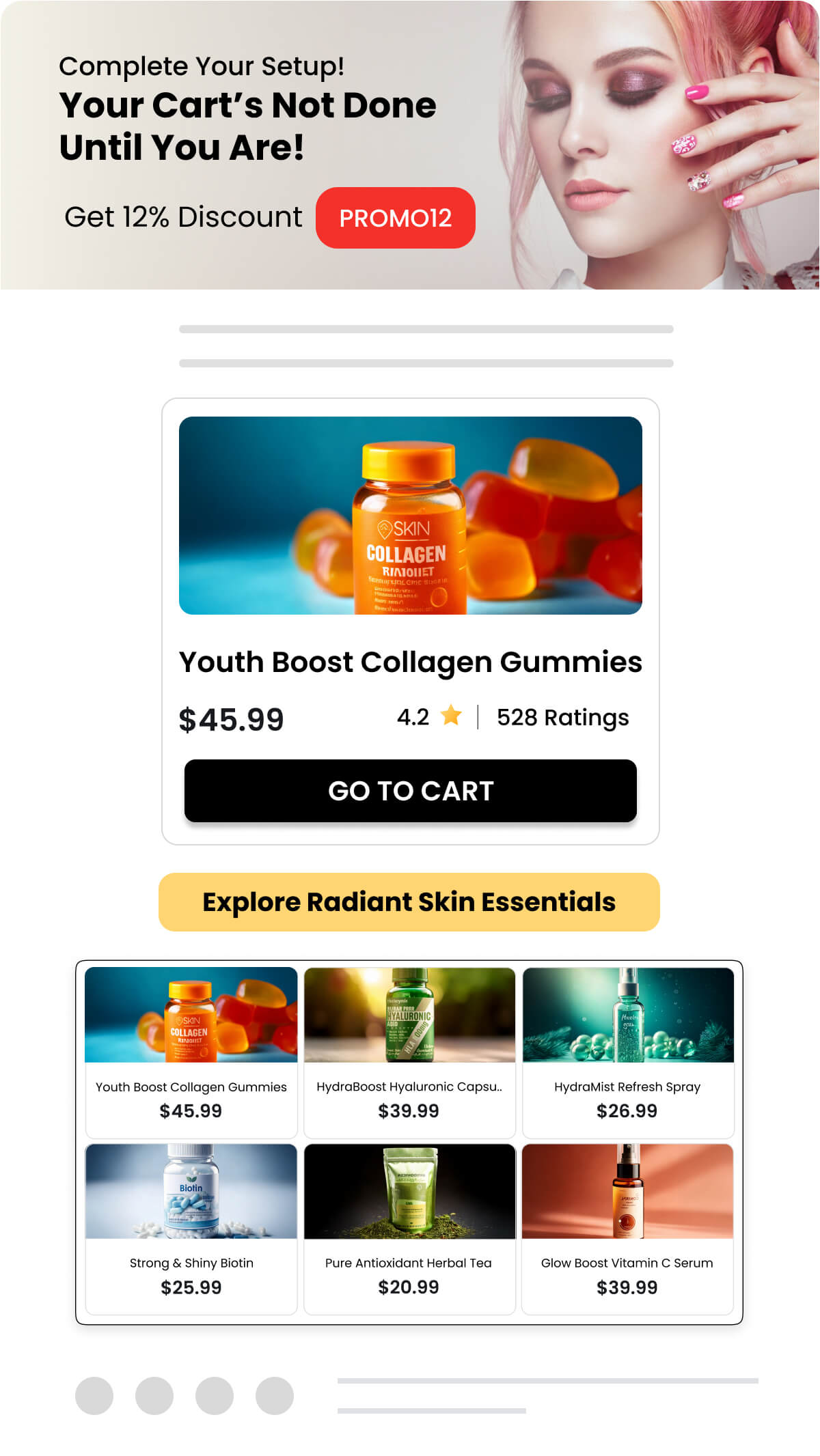 Use product collections in emails to re-engage shoppers by showcasing abandoned or viewed items with complementary products. For instance, if a shopper left behind collagen gummies, feature it alongside related items like a hyaluronic acid supplement, biotin capsules, and antioxidant tea. This approach rekindles interest, adds value, and offers a complete, tailored solution.
