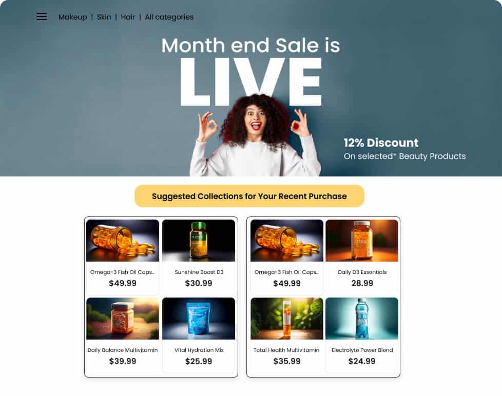 Display collections on the home page based on the shopper’s browsing behavior and purchase history. For example, if a customer bought Omega-3 capsules, suggest related supplements such as Vitamin D3, multivitamins, and hydration electrolytes, creating a customized shopping experience that guides them toward complementary products.
