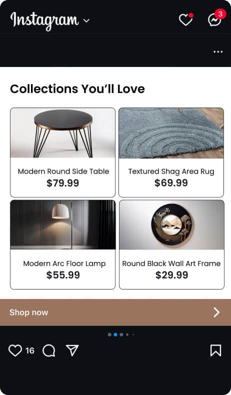 Increases engagement and traffic by leveraging the visual appeal of curated furniture and decor collections on social media.