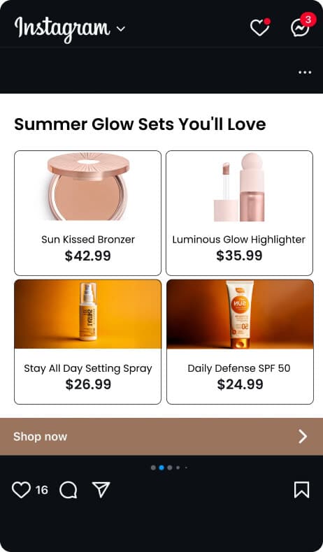 Incorporate curated product collections into social media ads and posts to create visually compelling, shareable content that attracts both existing and new customers. For example, promote a “Summer Glow” set with bronzer, highlighter, setting spray, and SPF to drive engagement and improve product discovery.