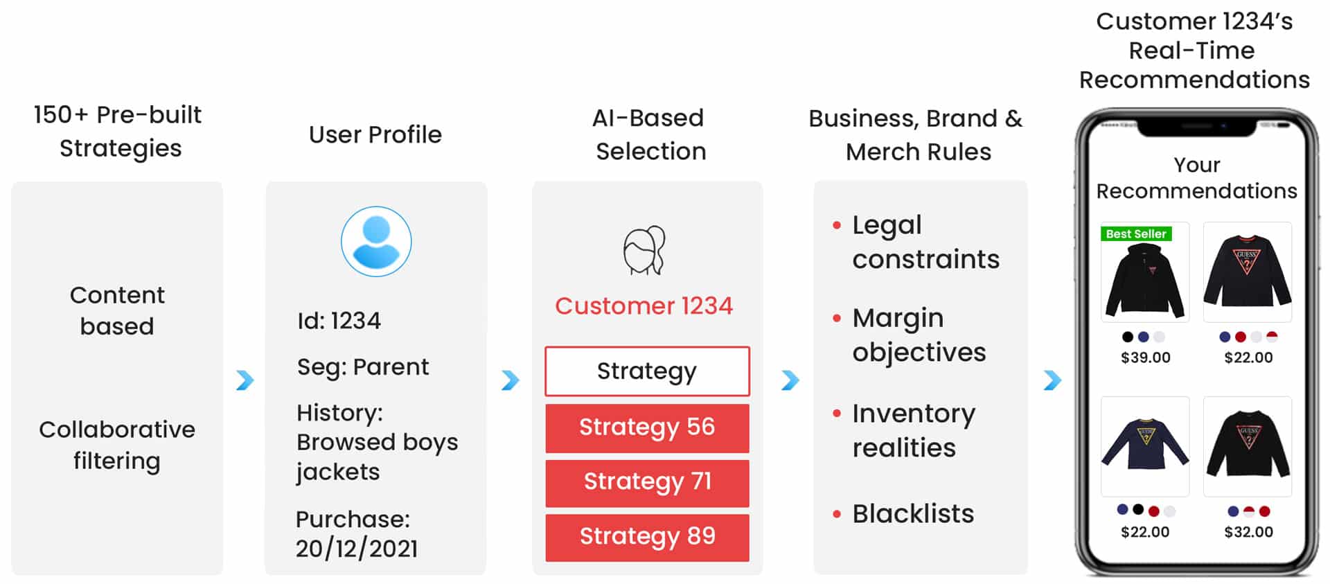 Leverage 150+ algorithms out-of-the-box including advanced personalization strategies like Deep Recommendations NLP and Visual AI.