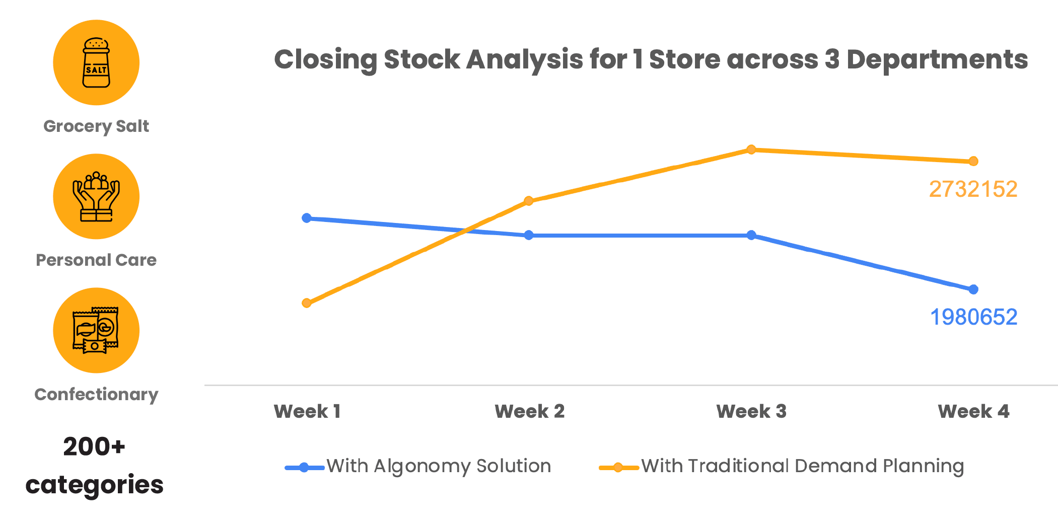Algonomy’s demand forecasting and replenishment solution, part of its larger merchandise AI suite of solutions for retail, was the perfect match for the client’s requirement. It uses unique and retail-native handcrafted algorithms to achieve a near-perfect match between demand and supply. Its plug and play ability allows retailers to quickly realize return on investment without having to spend organizational resources in setting up or compromising on key business metrics.