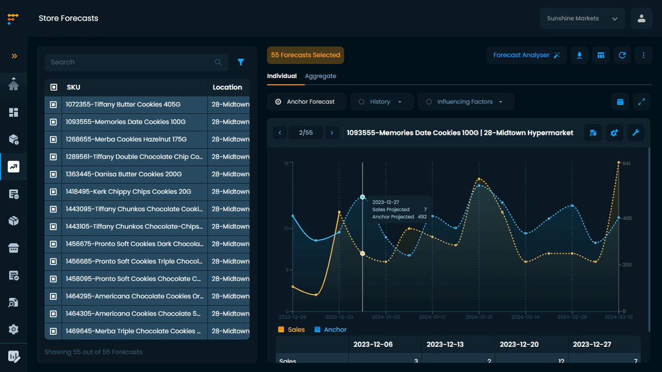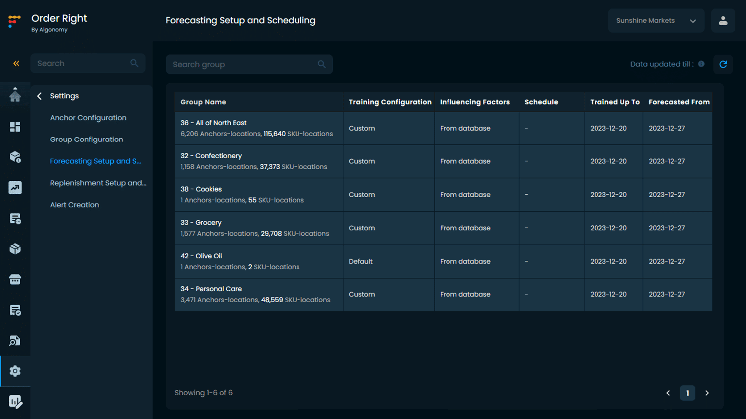 Now, the forecasts for all the anchors across all locations are displayed in a single dashboard, in different groups for centralized operation. Each forecasting group has multiple Anchors and each Anchor has several SKUs with locations.